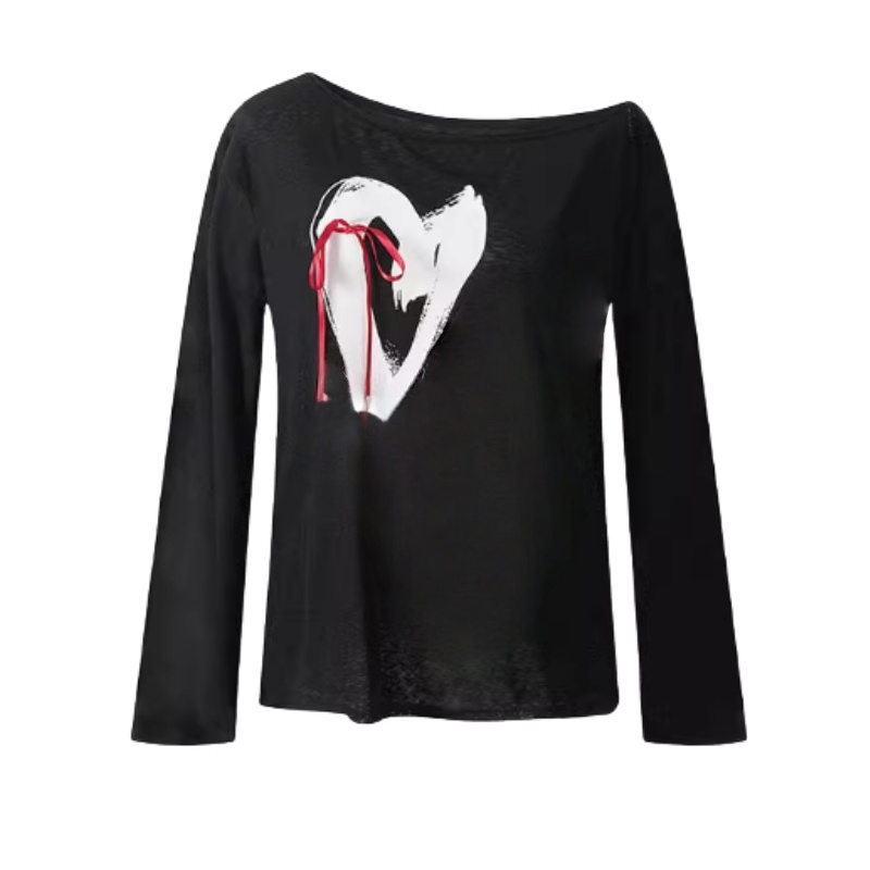 Black Long Sleeve Top with Wide Neck and Heart Print